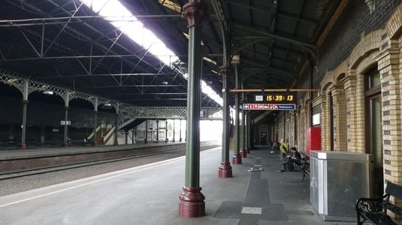 Geelong Station is the main station for Geelong, with a large brick station building adjacent to platform 1, an island platform linked by an overhead footbridge, and an iron train shed over it all. Inside the building is a booking office, large waiting room, luggage desk, lockers, and a privately operated kiosk. It is a busy station off-peak, but sees less usage by commuters due to the the lack of car parking and the difficult access to it.