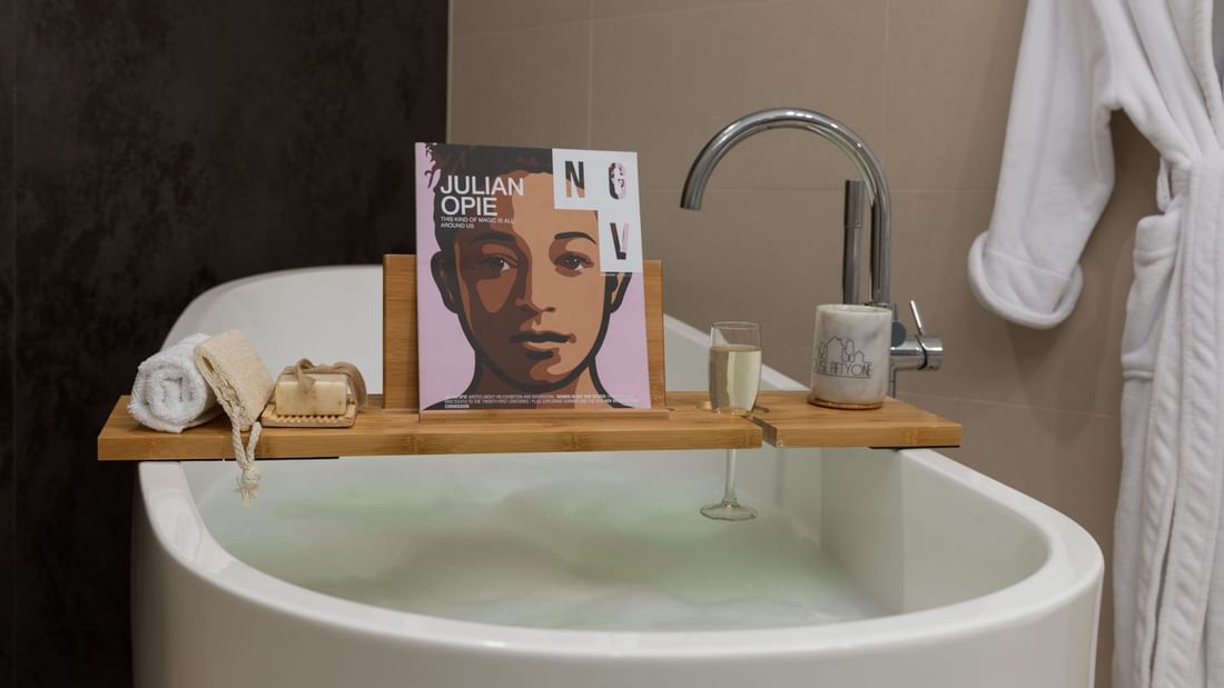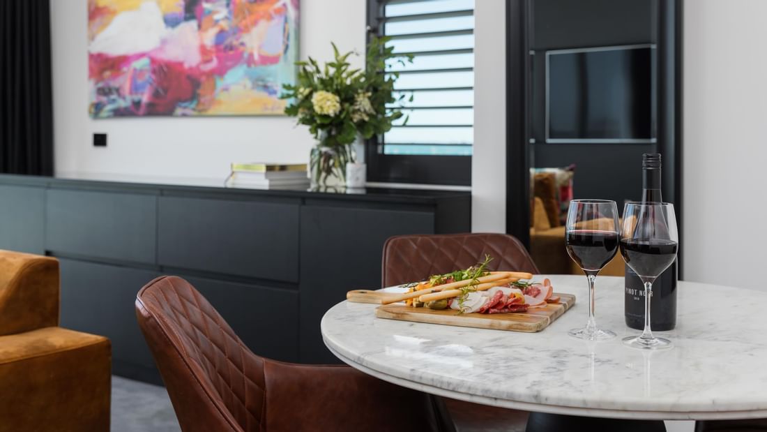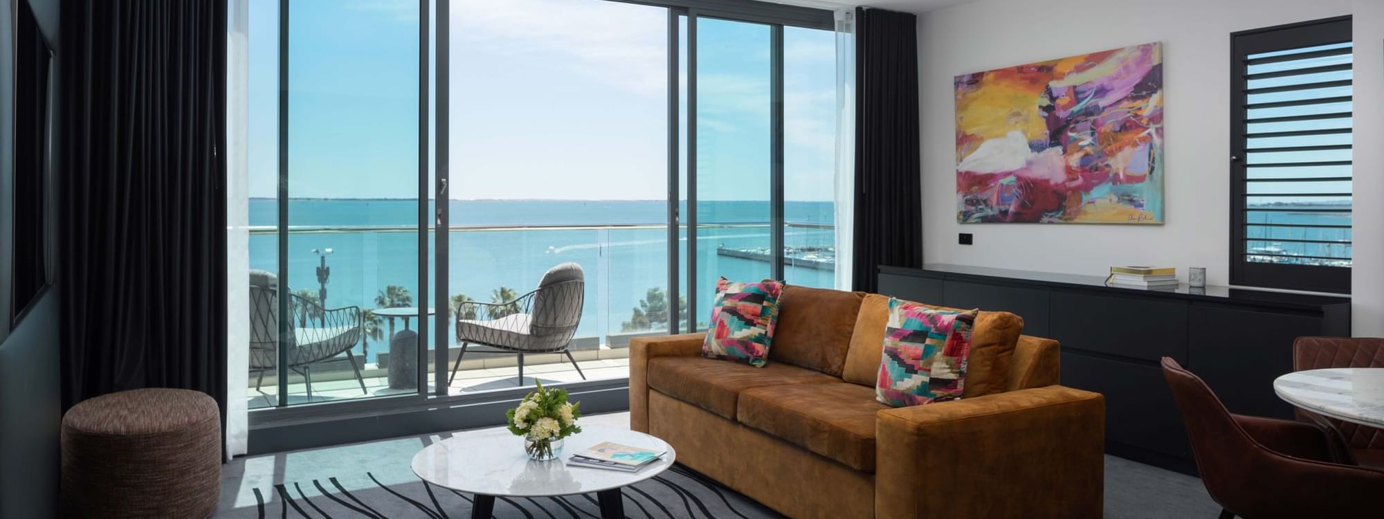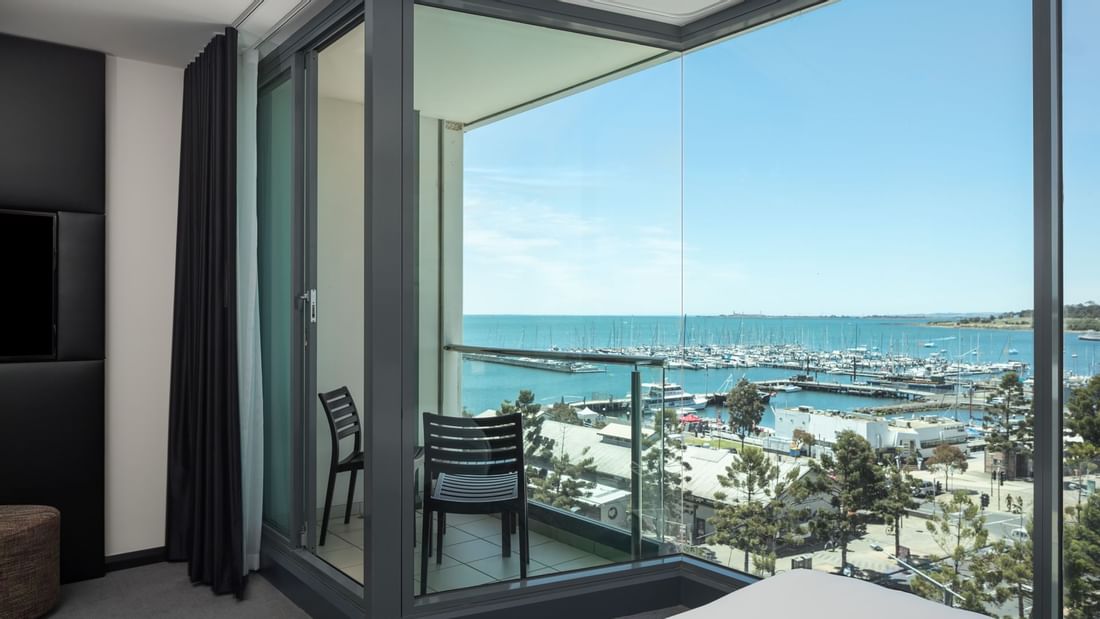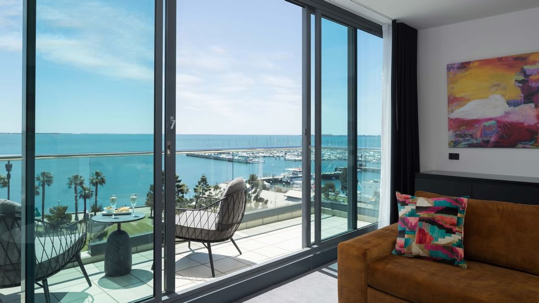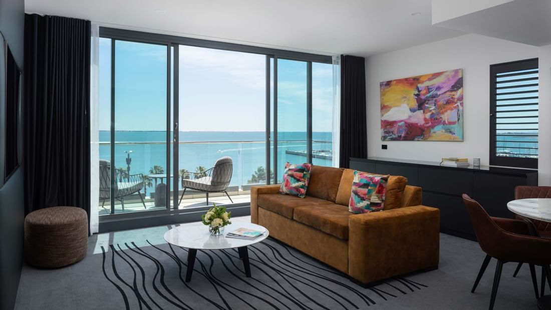 Enjoy sweeping bay views from the top floor in our suite complete with a King bed, two balconies, two 55" TVs with FOXTEL, free standing soaking tub, and walk-in shower.  Offering a separate lounge with a sofa bed, dining area and coffee pod machine.