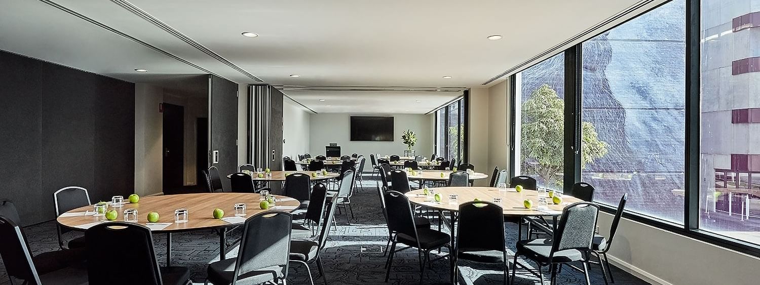 Moorabool Room 1-2 is located to the back of the hotel on level 2 and has a large window allowing for plenty of natural light. Moorabool Room 1-2 is ideal for conferences, meetings, breakout groups or trade display. Moorabool Room 1-2 can accommodate up to 64 banquet, 84 theatre, 90 cocktail, 48 classroom or 56 cabaret style.