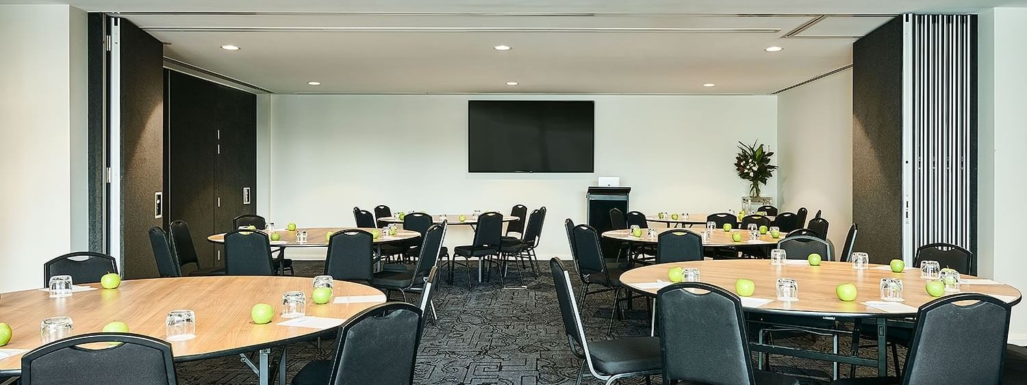 Moorabool Room 2-5 is located to the back of the hotel on level 2 and has a large window allowing for plenty of natural light. Moorabool Room 2-5 is ideal for conferences, meetings, breakout groups or trade display. Moorabool Room 2-5 can accommodate up to 64 banquet, 90 theatre, 90 cocktail, 48 classroom or 56 cabaret style.