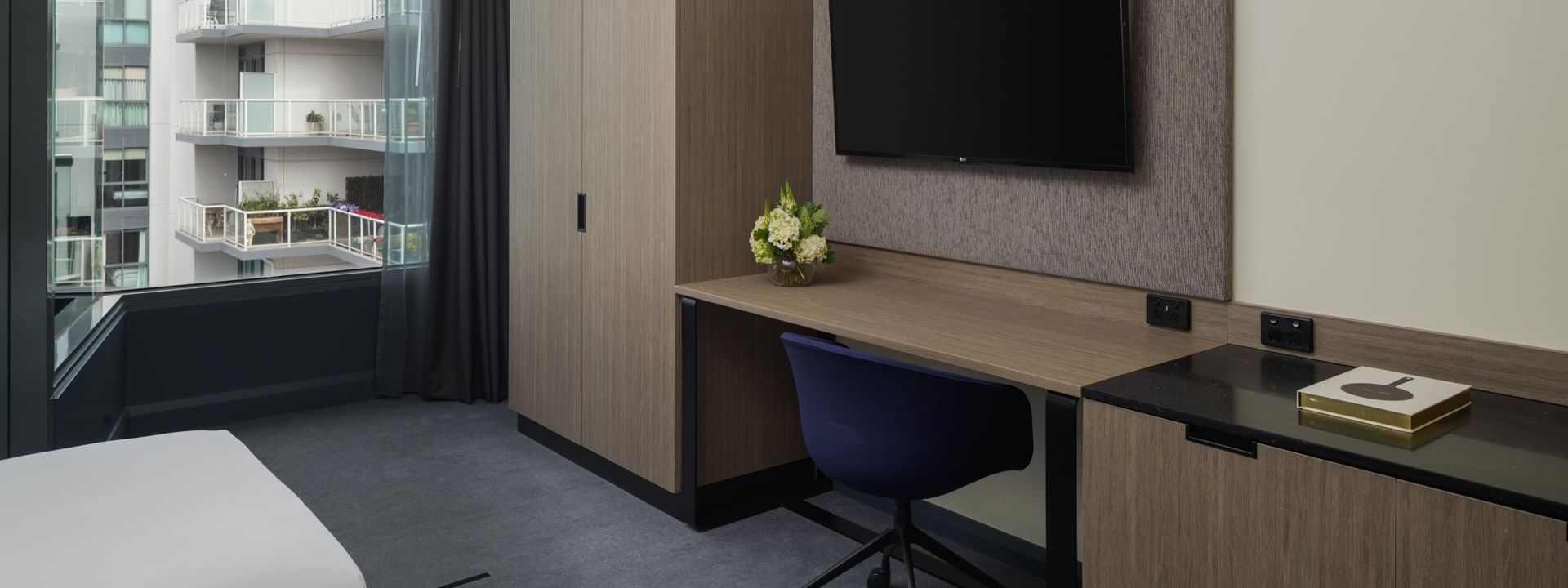 Stay with ease in our Accessible Room, featuring two single beds, bathroom with grab rails, roll-in shower, and shower seat. Includes a work desk, 49" TV with FOXTEL and Chromecast, and WIFI, with close access to lifts. Ideal for up to two guests.