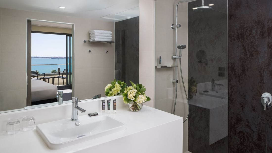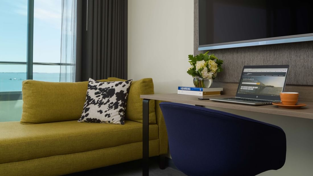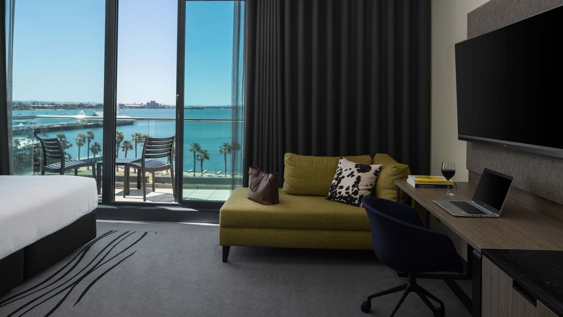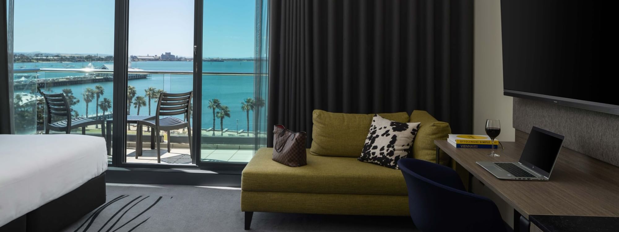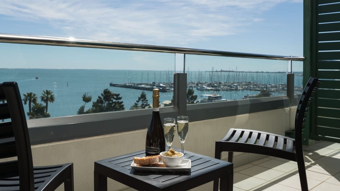 Experience stunning waterfront views in our Deluxe Room, featuring a King bed, work desk, 55" TV with FOXTEL and Chromecast, complimentary WIFI and a double balcony. Relax with added amenities including a coffee pod machine, bathrobes and slippers.